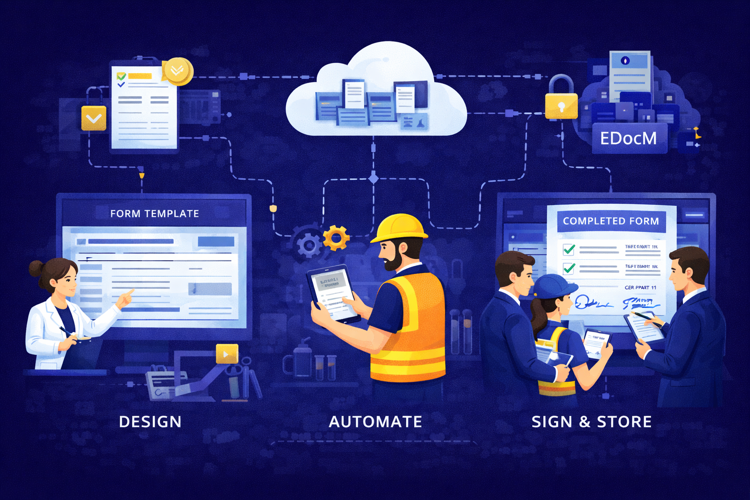 All completed records are stored centrally and integrated directly with EDocM — meaning every executed, approved form automatically becomes part of your governed document repository without any manual file management.